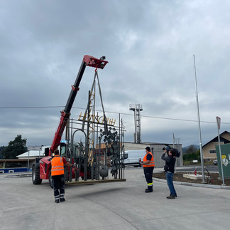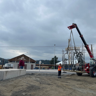 Unter dem Applaus von Bgm. Alois Lenz, Vizebgm. Karl Oswald, Astrid Orell, Johann Moitz, Alois Krammer, Norbert Schneeberger, Birgit Kröpfl, Walter Pressnitz & Co. wurde das Kunstwerk, just in dem Moment, wo die Sonne hell leuchtend auf den Kreisverkehr strahlte, auf den betonierten Sockel in der Mitte es großen neuen Kreisverkehrs gehoben. Dort wird nach der Fertigstellung des Kreisverkehres und der Bepflanzung auch die kunstvolle schmiedeeiserne Ortstafel in der Dunkelheit im Licht von Scheinwerfern als leuchtendes Beispiel für die Geschichte der Eisenverarbeitung im Sulmtal erstrahlen sowie den Kreisverkehr optisch und künstlerisch aufwerten.