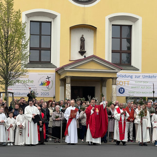 Mit dem Kreuz des Erlöser voran zog man dann wieder mit Musikbegleitung von der Klosterkirche in die Stadtpfarrkirche, wo gemeinsam gesungen und die Hl. Messe gefeiert und bei der Leidensgeschichte an Jesu Kreuzweg gedacht wurde.